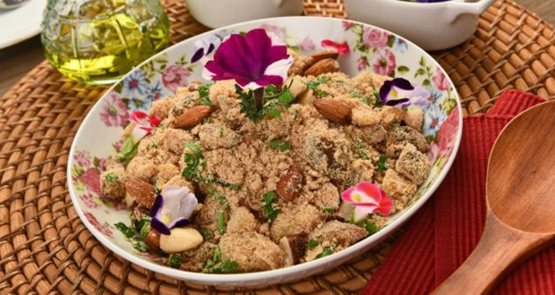 Ingredientes: 50 ml de azeite extravirgem 1 cebola picada em cubinhos 1 alho picado em cubinhos 500 g de farinha de mandioca tostada 200 g de […]