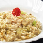 Risoto de costela suína com queijo gouda, nozes e alho poró